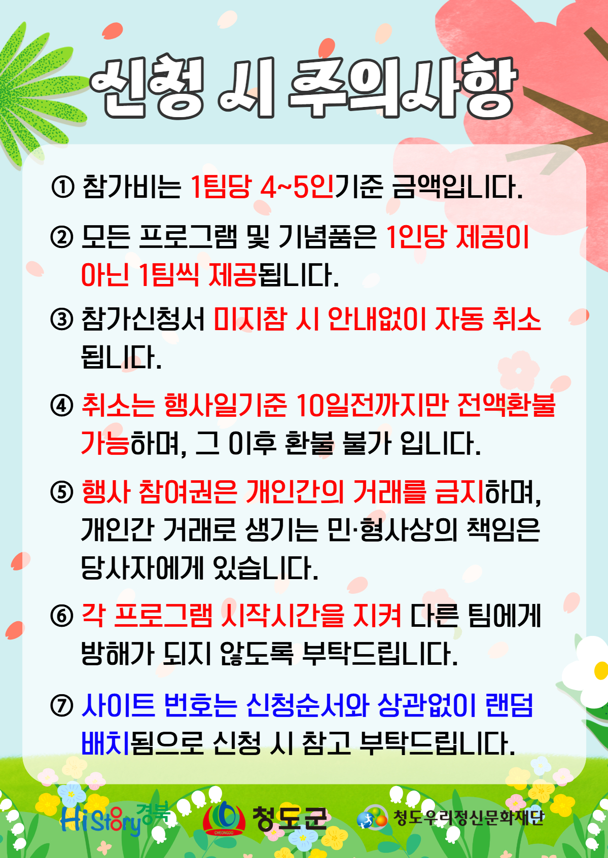 - 취소는 4월 1일까지 신청된 건에 한해서 전액 환불되며 그 이외의 건은 환불 불가입니다.(원활한 행사준비와 진행을 위하여 협조부탁드립니다.)